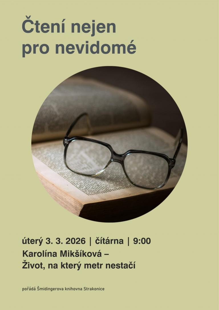 Čtení nejen pro nevidomé Čtení nejen pro nevidomé Út, 03/03/2026 - 10:00 Příjemné dopoledne u čtení z knihy Život, na který metr nestačí od Karolíny Mikšíkové. Čítárna, od 9:00 hod. Číst dále...